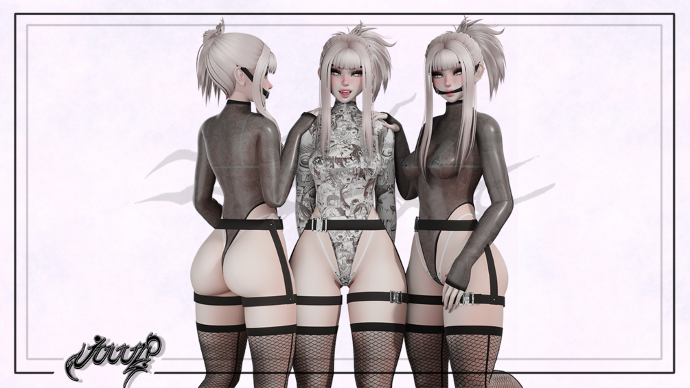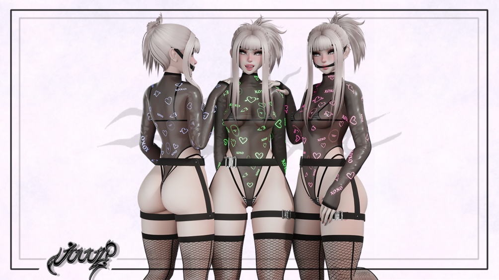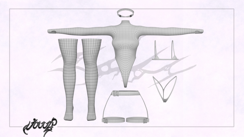 -bodysuit (7.2k tris), bikini (4k tris), harness (9.3k tris), buckle gag ( 5.3k tris), socks/fishnets ( 4.4k tris)